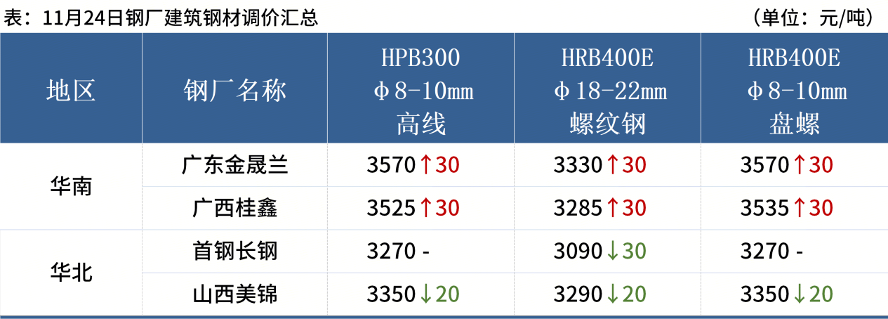 ◎ 11月24日,全國主港鐵礦石成交112.10萬噸,環(huán)比增22.4%;237家主流貿(mào)易商建筑鋼材成交13.11萬噸,環(huán)比增37.9%。