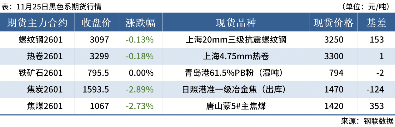 ◎ 11月25日,全國主港鐵礦石成交97.50萬噸,環(huán)比減13%;237家主流貿(mào)易商建筑鋼材成交10.14萬噸,環(huán)比減22.7%。