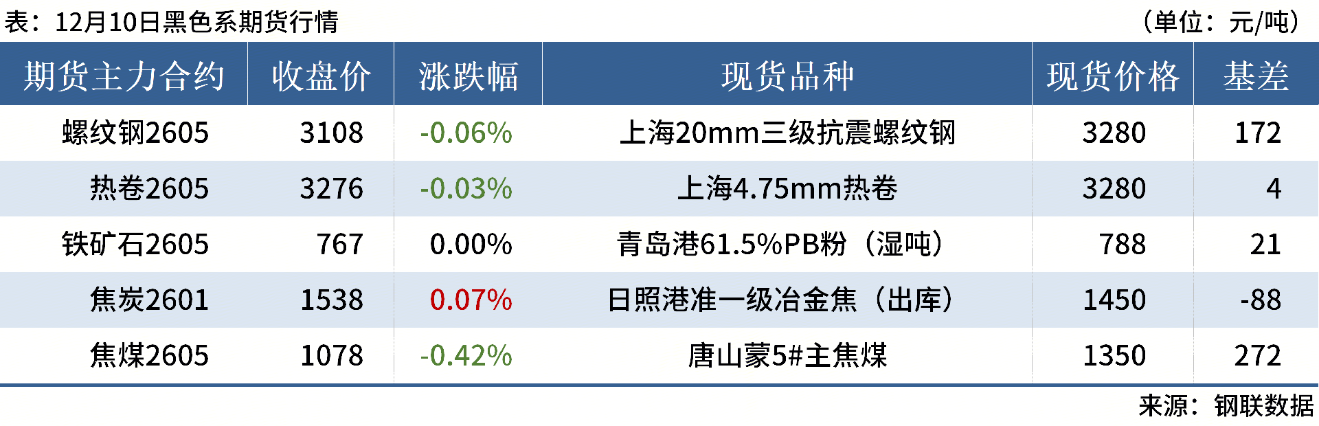 ◎ 12月10日,全國主港鐵礦石成交71.50萬噸,環(huán)比減37.1%;237家主流貿(mào)易商建筑鋼材成交11.43萬噸,環(huán)比增23.5%。