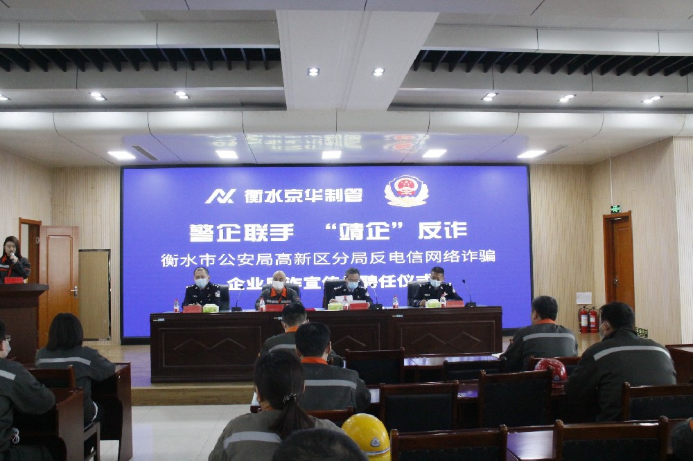 警企聯(lián)手 “靖企”反詐— 衡水京華召開企業(yè)反詐宣傳員聘任儀式4月28日,衡水市公安局高新區(qū)分局黨委委員、副局長張?bào)K等一行4人蒞臨公司宣傳反詐知識(shí),在公司辦公樓五樓召開了以“警企聯(lián)手,‘靖企’反詐”為主題的企業(yè)反詐宣傳員聘任儀式。公司常務(wù)副總趙志強(qiáng),生產(chǎn)副總劉國勇,總經(jīng)理助理馬亮同公司員工代表參與會(huì)議。會(huì)議上衡水市公安局···