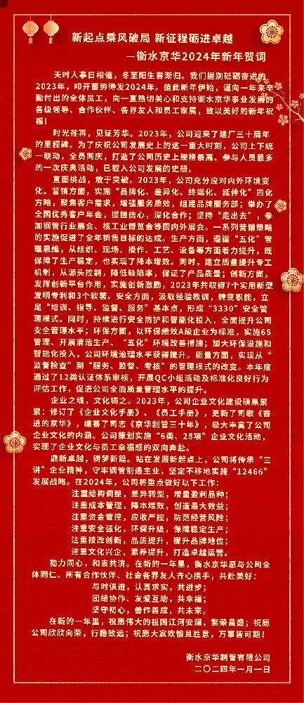 不負春光起好步 奮楫爭先開新局衡水、鄭州、日照京華舉行新春團拜會龍騰萬象更新,春華漸濃人間。為立足新起點,錨定新目標,增強合作凝聚力,2024年3月,衡水、鄭州、日照京華先后在鄭州、長沙、南昌、杭州、合肥、無錫舉辦了新春團拜活動。公司領(lǐng)導團隊與各區(qū)域經(jīng)銷商、行業(yè)專家等歡聚一堂,滿懷美好憧憬,共同邁進充滿挑戰(zhàn)和機遇的新征···
